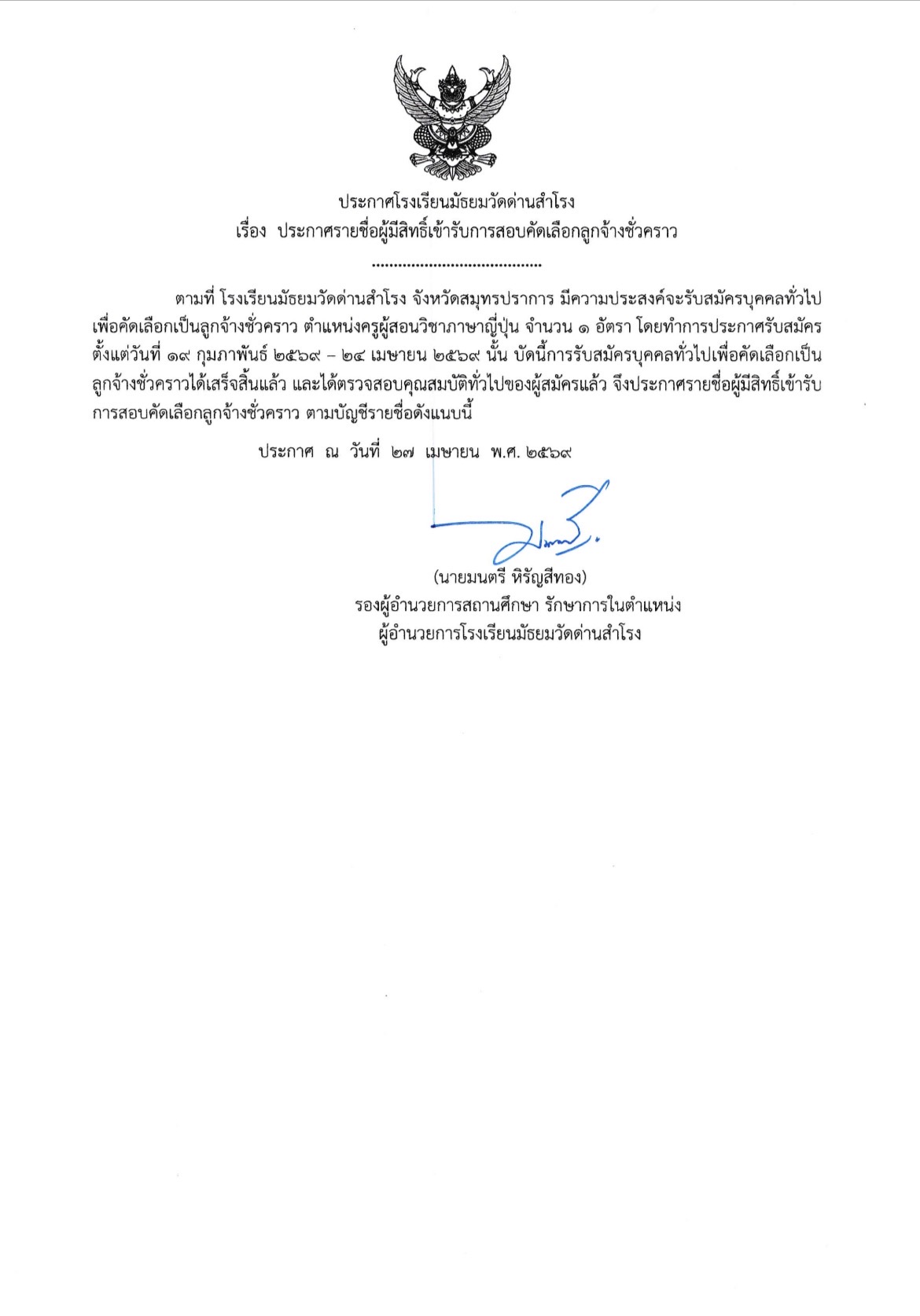 ประกาศผู้มีสิทธิ์เข้ารับการสอบสัมภาษณ์ ครูผู้สอนภาษาญี่ปุ่น